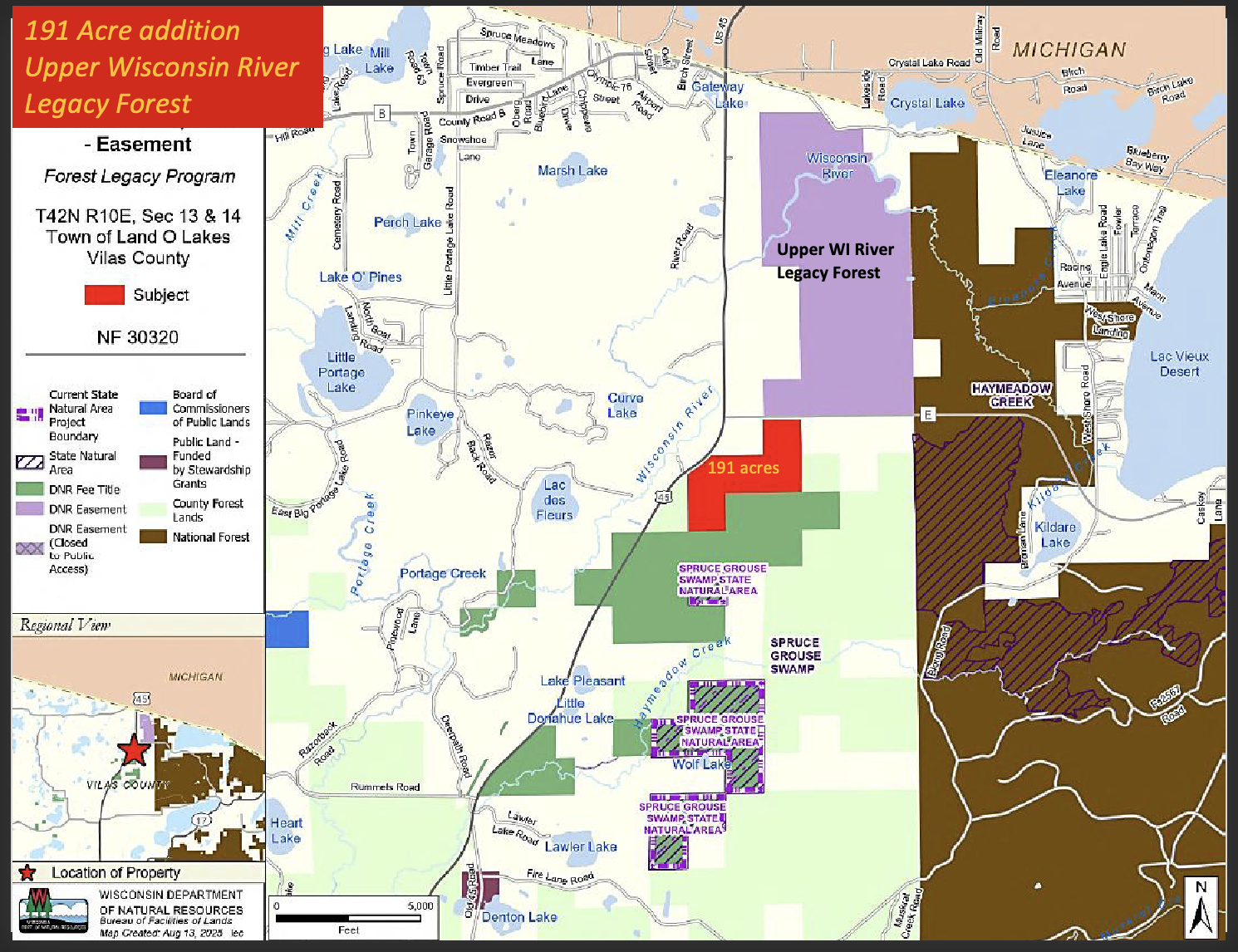 Access & Landscape Connectivity: Borders of this project include ¼ mile with the Upper Wisconsin River Legacy Forest, ¾ mile with Vilas County Forest and a full mile with State Forest Lands. UWRBH fronts on US Highway 45 and County Road E, with parking on the adjoining Upper Wisconsin River Legacy Forest.
